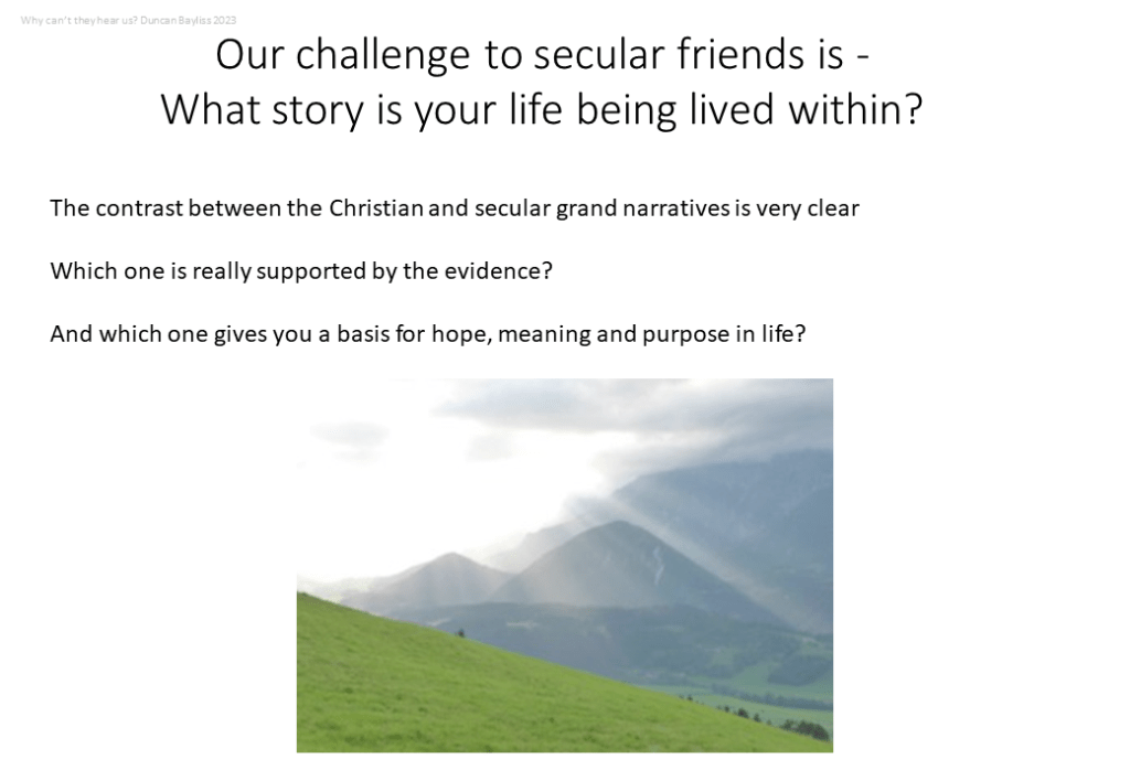 Secularism presents a multi-dimensional challenge to Christian belief and there are no quick easy answers for how to communicate effectively what we believe. A century ago it was possible to assume a basic Christian worldview in most people in Europe and North America and that gave them a starting point for considering Christian belief. That is no longer true. So how should Christians respond?